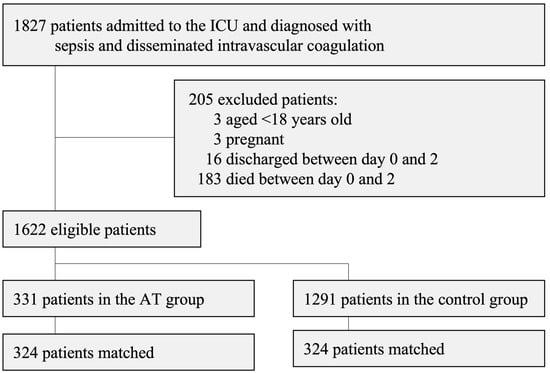 We identified adult (≥18 years old) patients admitted to the ICU and diagnosed with sepsis and DIC between April 2008 and September 2021. The diagnostic codes of sepsis and the source of infection were based on a previous study using the DPC database [13]. The diagnosis of DIC used the ICD-10 code of D65. We performed a landmark analysis to account for an immortal time bias with the time point of the third day of hospitalization (“day 2” because the first day of hospitalization was defined as day 0 in the present study). The following patients were excluded from the analysis: (1) women during pregnancy, (2) patients discharged between day 0 and day 2, and (3) patients who died between day 0 and day 2. Patients administered AT during the first three days after hospitalization (day 0, day 1, or day 2) were defined as the AT group, and those who did not have the code of AT during the first three days as the control group.