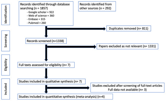 The initial literature search yielded a total of 1381 potentially eligible articles. A total of 447 duplicates were removed, with a total of 934 records being screened based on their title and abstract. Based on the previously defined inclusion and exclusion criteria, seven full texts were assessed for eligibility and were included in the qualitative synthesis. Only four of these articles met the criteria for inclusion in the quantitative synthesis [13,17,22,23] (Figure 1).
