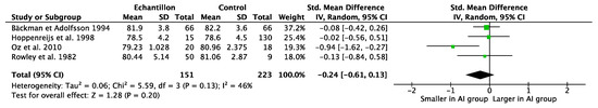 Figure 5. Forest plot comparing the intermaxillary angle in individuals with amelogenesis imperfecta compared to a control group [13,17,22,23]. CI = confidence interval; IV = inverse variance; SD = standard deviation.