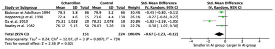 With regard to dental cephalometric characteristics, only the overbite measurement, a linear measurement, was available from three of the included studies representing 101 individuals with AI. A forest plot comparing overbite in individuals with and without AI (Figure 6) showed that overbite was significantly smaller in those with AI (SMD = −1.15; 95% CI −2.22, −0.08; p = 0.04).