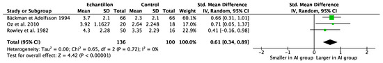 Data for the ANB angle, an angular measurement, were available from three studies representing 136 individuals with AI. A forest plot comparing the ANB angle between individuals with and without AI (Figure 4) shows a statistically significant larger ANB angle in those with AI (SMD = 0.61; 95% CI 0.34, 0.89; p < 0.01). Low heterogeneity was found among the studies (I2 = 0%).