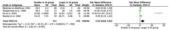 The only vertical skeletal cephalometric characteristic that was included in three or more studies was the intermaxillary angle, for which data were available from four studies including 151 patients with AI. All of these studies defined the intermaxillary angle as the angle between the maxillary plane (anterior to the posterior nasal spine) and mandibular plane (Menton to Gonion). A forest plot comparing the intermaxillary angle between individuals with and without AI (Figure 5) shows a significantly larger intermaxillary angle in those with AI (SMD = 2.26; 95% CI 0.68, 3.84; p < 0.05), with considerable heterogeneity across studies (I2 = 95%). Because of this heterogeneity, sensitivity analyses were performed removing each individual study from the meta-analysis, and no significant changes to the overall mean difference were observed.