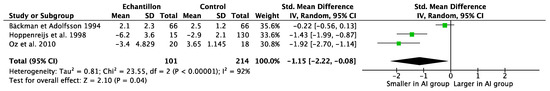 Figure 6. Forest plot comparing overbite in individuals with amelogenesis imperfecta compared to a control group [13,22,23]. CI = confidence interval; IV = inverse variance; SD = standard deviation.
