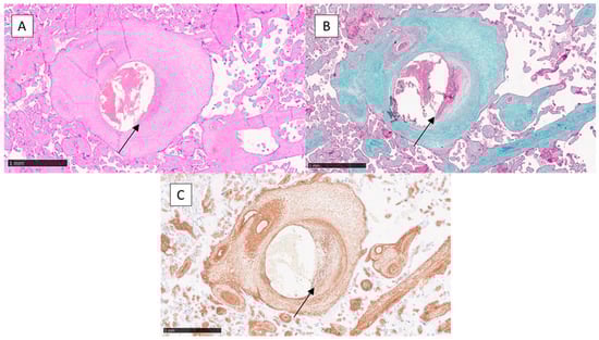 (A) Histological photomicrograph showing disarrangement of the muscle fibres of the middle tonaca of the arteries (black arrow), characteristic of class B (Hematoxylin–Eosin, original magnification 10×). (B) Histochemical preparation showing further disarrangement of the muscle fibres of the wall with aspects of initial arterial thrombosis (Masson’s trichrome, original magnification 10×). (C) Immunohistochemical preparation with anti-SMA antibody showing disarrangement of the muscle fibres of the wall and different types of orientation (black arrow) (Immunohistochemistry for SMA, original magnification 10×).