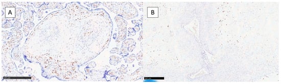 Finally, we performed immunohistochemical investigations for CD68 (PG-M1) and Ki-67 to assess the distribution of macrophage in the area of angiodysplastic changes in the two classes (A and B) and to evaluate the potential difference of proliferation index at this level. In class A, CD-68 showed a tendency to be present at the level of the tonaca intima/medium of the vessels (Figure 3A), as well as in Hofbauer cells present in the villi, while in class B, CD-68 was positive only in Hofbauer cells with no presence at the level of the vessel wall (Figure 3B).