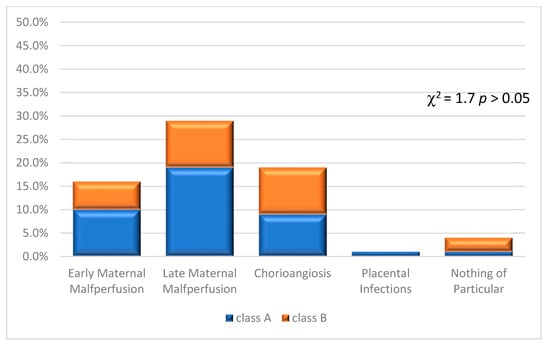 Another assessment carried out in the course of our study was the frequency of placental lesions, found during reporting, according to the classification drawn up in the 2015 Amsterdam Consensus Conference in placentas with a concomitant diagnosis of angiodysplasia (Figure 5). Secondly, the distribution of these placentas in class A and B was analysed. In this summary, a histological report may have led to the inclusion of the same placenta in more than one category due to the concomitance of several etiopathogenetic pictures. The distribution of placental lesions, according to Amsterdam Criteria, was not significantly different between placentas of class A and B (χ2 = 1.7 p > 0.05).