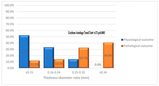 A highly significant trend emerges from the data (Cochran–Armitage Trend Test = −4.72, p < 0.0001): as the absolute value of the Tmax/Dmax ratio increases, the physiological outcome decreases, from 52.4% in the first quartile, 33.3% in the second quartile, 14.3% in the third quartile to 0.0% in the last quartile, respectively. Consensually, the pathological outcome increases from 12.2% in the first quartile, 14.3% in the second quartile, and 32.7% in the third quartile to 40.8% in the last quartile, respectively.
