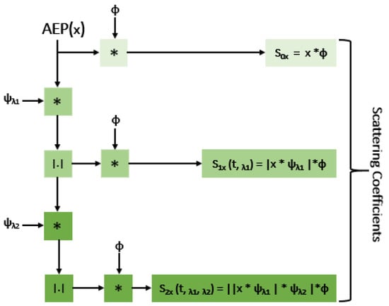 The use of wavelet scattering transform (WST) for signal processing was introduced by Prof. Stéphane Mallat and has grown in popularity over recent decades [62,63]. Mallat et al. proved the WST’s ability to retrieve trustworthy information at various scales. This transform may yield time and frequency resolutions that are translation-invariant, deformation-stable, and maintain high-frequency classification information [64,65]. In other literature, it has been demonstrated that wavelet scattering coefficients are more insightful than Fourier transform coefficients when handling signals with brief variation or minor deformation and rotation invariant [62,66,67]. In addition, WST combines the benefits of conventional and deep learning methodologies [68], integrating common properties of multiscale contractions, the linearization of hierarchical symmetries, and sparse representation.