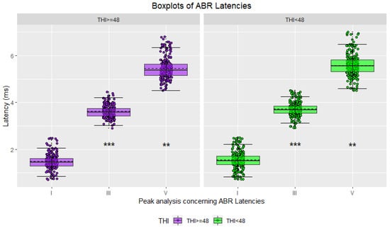 Boxplots of ABR waveform latencies based on tinnitus distress (in purple: severe/high tinnitus distress; in green: mild/moderate tinnitus distress; asterisks indicate significance: ** p-value ≤ 0.01; *** p-value ≤ 0.001).