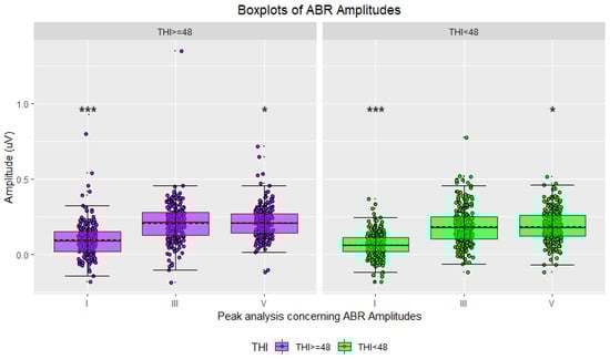 Boxplots of ABR waveform amplitudes based on tinnitus distress (in purple: severe/high tinnitus distress; in green: mild/moderate tinnitus distress; asterisks indicate significance: * p-value ≤ 0.05; *** p-value ≤ 0.001).