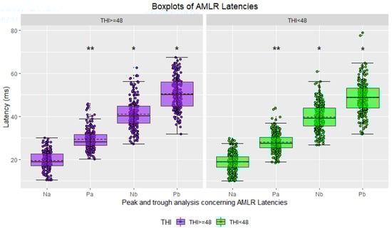 Boxplots of AMLR waveform latencies based on tinnitus distress (in purple: severe/high tinnitus distress; in green: mild/moderate tinnitus distress; asterisks indicate significance: * p-value ≤ 0.05; ** p-value ≤ 0.01).