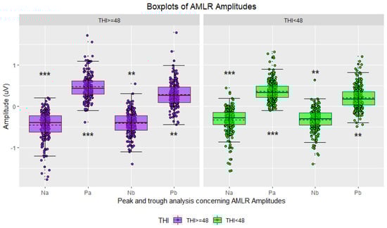 Boxplots of AMLR waveform amplitudes based on tinnitus distress (in purple: severe/high tinnitus distress; in green: mild/moderate tinnitus distress; asterisks indicate significance: ** p-value ≤ 0.01; *** p-value ≤ 0.001).