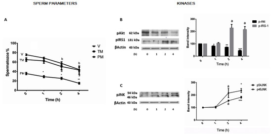 Figure 1. Effect of 4 h incubation time on sperm motility, viability, activated protein kinase B (p-Akt), activated insulin-substrate-1 (p-IRS1 ser312), and activated c-Jun N-terminal protein kinase (p-JNK isoforms) levels. (A)—Total (TM), progressive motility (PM), and vitality (V) are plotted as function of time. Data represent results of analyses replicated five times on independent samples. (B)—At the end of each indicated time sperm lysates were subjected to immunoblotting with specific antibodies, as described under Material and Methods. A representative immune-blot for p-Akt and p-IRS-1ser312 is shown (left) and similar results were obtained in two other independent experiments. The bar plots for p-Akt and p-IRS-1 ser312 show the summarized data of the band intensities (Arbitrary Units) after being normalized to β-actin (right). (C)—Representative immunoblot (left) for the p46 and p54 JNK isoforms. Results of band intensities of the three experiments are also shown (right). Each column shows mean ± SEM. Data were analyzed by one-way ANOVA (p < 0.02 for all panels) and post hoc comparison of means was determined using Fisher’s PLSD test. (A) * p < 0.0003 vs. 0; ** p < 0.0001 vs. 0; a p < 0.01 vs. 0; b p < 0.003 vs. 0. (B,C): * p < 0.008 vs. 0; ** p < 0.002 vs. 0; *** p < 0.0003 vs. 0; a p < 0.01 vs. 0.