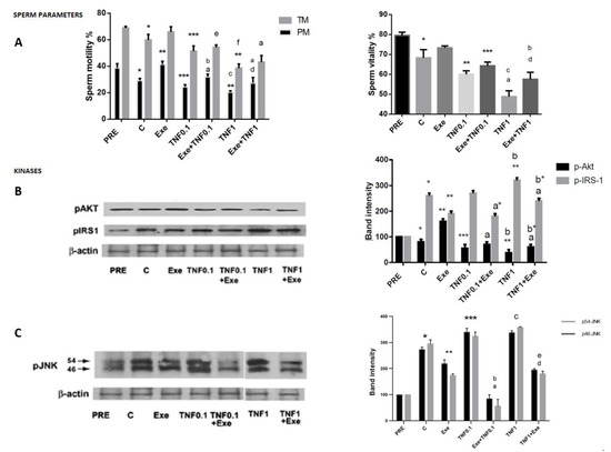Figure 5. Interaction of Exe and TNF on parameters and signaling pathways of human sperm including activated kinase B (p-Akt), activated insulin substrate-1 (p-IRS-1 ser312), and activated c-Jun N-terminal protein kinase (p-JNK isoforms). (A)—Motility (PM, TM) (left) and vitality (V) (right) of human sperm incubated with Exe for 90 min in presence or absence of different doses of TNF-α as indicated, added after 45 min. (B)—Representative immunoblot of Akt and IRS-1 is shown (left) and similar results were observed in other independent samples with the quantitation of the band intensities (right). (C)—Left panel representative immunoblot of p-JNK isoforms and right panel summarized band intensities of analysis of independent measurements. Results are mean ± SEM of experiments repeated from three (B,C) to five measurements (A) performed with sperm samples from different subjects. Data were analyzed by one-way ANOVA. Comparisons among group means were conducted using Fisher’s PLSD test. (A)—Left: * p < 0.0001 vs. PRE; ** p < 0.0001 vs. C; *** p < 0.01 vs. C; a p < 0.0001 vs. Exe; b p < 0.0002 vs. TNF0.1; c p < 0.02 vs. TNF0.1; d p < 0.005 vs. TNF1; e p < 0.002 vs. Exe; f p < 0.0009 vs. TNF0.1. (A)—Right-: * p < 0.001 vs. PRE; ** p < 0.01 vs. C; *** p < 0.0001 vs. Exe; a p < 0.006 vs. C; b p < 0.0001 vs. Exe; c p < 0.0001 vs. TNF0.1; d p < 0.008 vs. TNF1. (B): * p < 0.001 vs PRE; ** p < 0.0001 vs. C; *** p < 0.009 vs. C.; a p < 0.0001 vs. Exe; a* p < 0.0001 vs. TNF 0.1; b p < 0.01 vs. TNF 0.1; b* p < 0.001 vs. TNF 1. (C)—Right: (statistic for both bars) * p < 0.01 vs. PRE; ** p < 0.001 vs. C; *** p < 0.002 vs. C; a p < 0.0001 vs. Exe; b p < 0.0001 vs. TNF 0.1; c p < 0.0002 vs. C; d p < 0.02 vs. Exe, only for p46 isoform; e p < 0.001 vs. TNF1. PRE, values at time zero incubation, C, values of untreated samples at the end of incubation.