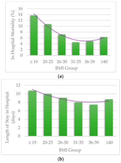 A reverse-J relationship was found between the BMI and the study outcomes. Underweight patients (BMI ≤ 19 kg/m2) had higher mortality and longer LOS, as did the normal-weight patients (BMI 20–25 kg/m2) when compared to the higher BMI groups (Figure 1). The seemingly protective effect of a higher BMI diminished in the highest BMI group (BMI ≥ 40 kg/m2). The overall mortality rate during the study period was 7.7%, with a noticeably higher rate in under-weight (13.7%) and normal-weight (10.7%) patient population groups (p < 0.001) (Table 1). The overall mean LOS was 9.00 ± 0.07 days. Longer LOS was documented in the under-weight (10.74 ± 0.21 days), normal weight (9.99 ± 0.19 days), and over-weight subgroup (9.08 ± 0.19 days) (p < 0.001) (Table 1).