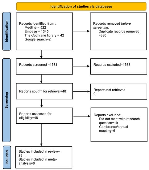 Figure 1 contains the Preferred Reporting Items for Systematic Reviews and Meta-Analyses (PRISMA) flow diagram for our search strategy. Our systematic search identified a total of 1911 papers. Of those, 330 duplicates were removed, and 1581 titles and abstracts were reviewed. Articles that did not match the research question, meeting abstracts, papers that did not have at least one HbA1c measurement or did not report fetal macrosomia or LGA were excluded. We selected 48 articles for full-text review. We excluded a further 25 articles, as they did not have the data required for our systematic review. The remaining 23 articles were selected for inclusion in our systematic review. Reference lists from these 23 papers were investigated for additional articles. However, no other relevant articles were found. Finally, after carefully reviewing the data presented in these 23 articles, we had 8 articles for the meta-analysis. Amongst the eight articles in the meta-analysis [17,18,19,20,21,22,23], six studies reported the percentages of LGA babies stratified by high or low HbA1c levels, and four studies reported numbers of fetal macrosomia and HbA1c levels. Two studies, i.e., Sweeting et al. [19] and Katon et al. [21], reported both outcomes. The cut-off value for HbA1c for these eight studies, ranged from 5 to 6.5.