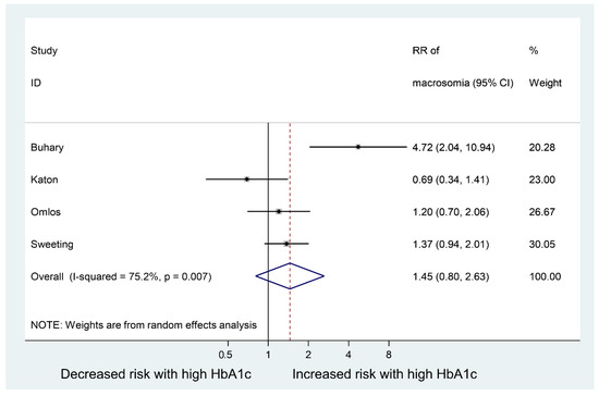Risk ratio of having a baby with fetal macrosomia in women with gestational diabetes mellitus (GDM) who have high vs. normal or low HbA1c levels.
