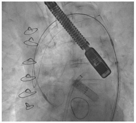 To further reduce the risk of CE during the procedure, the use of cerebral embolic protection devices is rapidly gaining traction [18]. These are filters designed to capture or deflect emboli traveling to the brain during the procedure. They are normally positioned across the origin of supra-aortic vessels at the beginning of the procedure and are retrieved at its end. Figure 2 shows the fluoroscopic image of the most frequently used cerebral embolic protection device (TriGUARD 3 CEP, Keystone Heart). While their role in transcatheter aortic valve replacement (TAVR) is more defined [19], clear data on their safety and efficacy in the context of LAAO are still lacking because less than 30% of the recruited patients in the abovementioned studies employed such devices. The choice regarding post-LAAO antithrombotic therapy is also of paramount importance. Clinical guidelines do not establish clear recommendations on how to manage patients who suffer recurrent CEs on OACs, besides assessing good therapeutic adherence. Indeed, it is not advised to either switch from one OAC therapy to another, nor to intensify anticoagulant therapies (e.g., supratherapeutic INRs, dual, or triple antithrombotic therapy). In clinical practice, several strategies are reported, such as unchanging OAC therapy, adding an antiplatelet drug, changing the DOAC, or switching DOAC to LMWH or VKA if the patient was on DOAC before the index event, with variable efficacy among studies [3,8]. In patients at very high thrombotic risk, LAAO may be essentially considered as an enhancement of OAC therapy. However, no consensus suggests whether to continue OAC therapy after LAAO, nor how to modify it. Even if large variability exists among retrospective studies, preliminary data show beneficial effects of OAC therapy continuation vs OAC interruption. In the metanalysis of Sharma et al., the majority of cases continued OAC therapy or switched to dual antiplatelet therapy after LAAO [15]. Bleeding complications occurred more frequently in patients who intensified anticoagulant therapy compared to those who performed LAAO and continued OAC therapy (10.5% vs. 22.5%, respectively [p = 0.102]). In a study by Marroquin et al., bleeding complications during intensified anticoagulant therapy occurred in 9.6% of patients, compared to 3.8% of patients who performed LAAO and continued the same OAC [10]. Margonato et al. demonstrated the independent protective role of maintaining lifelong OAC therapy vs. terminating it after LAAO, as well as a positive trend towards being survival-free regarding all-cause death, systemic stroke, CE, and major bleeding provided by this strategy [17]. Patients who may be candidates for LAAO historically include those with a previous history of bleeding complications on OAC, those with an increased risk of bleeding, and those who are unable to comply with OAC therapy. More recently, the possible use of LAAO in the synergy of OAC therapy in patients with extremely high embolic risk, such as those with evidence of failure of OAC therapy, has been proposed [20]. Despite the need for prospective randomized studies on this topic, current data have provided positive results, especially in terms of procedural safety. Moreover, further studies are needed to establish the appropriate antithrombotic strategy after LAAC.