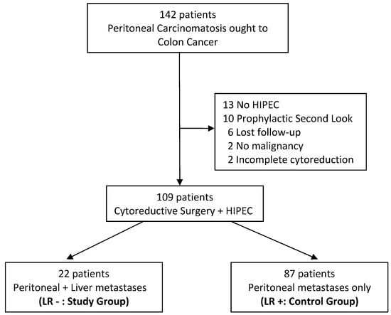 Between January 2010 and October 2022, 142 consecutive patients diagnosed with peritoneal carcinomatosis due to colon cancer underwent cytoreductive surgery and HIPEC. Of these, 33 patients were excluded for different reasons (Figure 1).