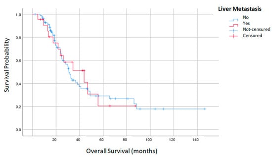 Peritoneal and liver metastases are the two most frequent causes of death in colorectal cancer []. In addition, peritoneal dissemination is the one with the worst prognosis with a 30% lower survival, probably due to a lower response to systemic chemotherapy [,], or as recently described, by the possibility of representing a mesenchymal molecular subtype (CMS4) with a strong TGF-activation, immune suppression and stromal invasion []. Furthermore, it is estimated that approximately 8% of patients with colon cancer develop hepatic and peritoneal metastases simultaneously [,] and until recently, these patients were considered unresectable and only amenable to palliative adjuvant chemotherapy with an overall survival of 12 months [,]. Indeed, the De Cuba meta-analysis reflected that as much as 25% of scheduled patients for liver surgery were discarded due to the finding of peritoneal metastases []. Elias et al. and a consensus statement has shown that patients with up to three liver metastases and a low peritoneal tumor burden (PCI < 12) did not suppose an absolute contraindication for a simultaneous treatment with CRC-HIPEC [,,,]. Following these criteria and after obtaining a complete tumor resection, a median OS of 25–45 months and an acceptable morbidity and mortality rates could be achieved [,,,]. In a previous report, we updated our results and showed a median OS of 44 months in patients with simultaneous peritoneal and liver metastases resection [].