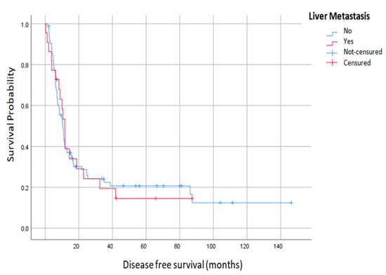 Disease free survival of liver plus peritoneal metastases and peritoneal metastasis alone.