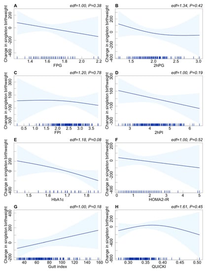 The potential nonlinear associations between glucose metabolism indicators and singleton birthweight among PCOS women undergoing their first IVF/ICSI cycles based on the generalized additive models using the “mgcv” R package (version R–4.0.3). (A–H): Change in singleton birthweight with the increase in FPG, 2hPG, FPI, 2hPI, HbA1c, HOMA2-IR, Gutt index, and QUICKI, respectively. Adjusted for preconception BMI (continuous), duration of infertility (continuous), ovarian stimulation regimen, gestational age, and delivery mode. The reference level (mazarine line) was set at the median. Blue shaded areas: 95% CI.