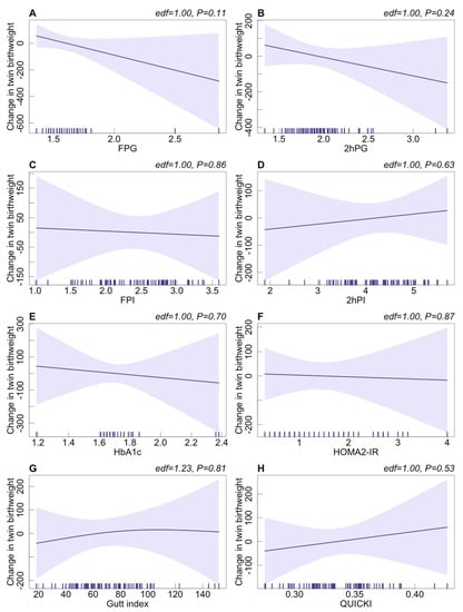 The potential nonlinear associations between glucose metabolism indicators and twin birthweight among PCOS women undergoing their first IVF/ICSI cycles based on the generalized additive models using the “mgcv” R package (version R–4.0.3). (A–H): Change in twin birthweight with the increase in FPG, 2hPG, FPI, 2hPI, HbA1c, HOMA2-IR, Gutt index, and QUICKI, respectively. Adjusted for preconception BMI (continuous), duration of infertility (continuous), ovarian stimulation regimen, gestational age, and delivery mode. The reference level (purple line) was set at the median. Lavender shaded areas: 95% CI.