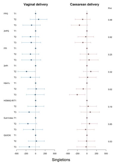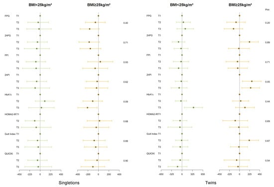 Statistical analyses were conducted with R software (version 4.0.3, R Foundation for Statistical Computing). The participants’ baseline reproductive and cycle characteristics were represented as the median (interquartile range (IQR)) or n (%). The homeostasis model assessment 2 estimate of insulin resistance (HOMA2-IR) was calculated with the HOMA2 Calculator (https://www.rdm.ox.ac.uk/about/our-clinical-facilities-and-mrc-units/DTU/software/homa, (accessed on 5 April 2023) version 2.2.4, University of Oxford, Oxford, UK) using FPG and FPI values []. The Gutt insulin sensitivity index was calculated as m/ (G × I), where m is a measure of glucose uptake during the OGTT calculated from body weight and fasting and 2 h glucose; G is the mean of fasting and 2-h glucose; and I is a log10 transformation of the mean of fasting and 2 h insulin []. The quantitative insulin sensitivity check index (QUICKI) was calculated as 1/[log (I0) + log (G0)], where I0 is the fasting insulin and G0 is the fasting glucose []. Differences in baseline reproductive and cycle characteristics between the singleton and twin groups were evaluated using the Kruskal–Wallis test for continuous variables and the Chi-squared test for categorical variables (or Fisher’s exact test where appropriate). The FPG, 2hPG, FPI, 2hPI, HbA1c, HOMA2-IR, Gutt index, and QUICKI were categorized into tertiles for the association analyses. When analyses required a normal distribution, FPG, 2hPG, FPI, 2hPI, and HbA1c were ln-transformed due to right skewness.