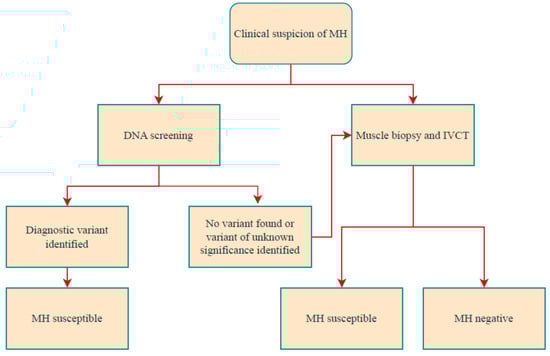 DNA screening on a patient’s blood sample is minimally invasive and affordable, but sensitivity is unfortunately only approximately 50% for the detection of MHS; RYR1 targeted analysis of the known MH-associated mutations or screening of the entire coding regions is possible [70]. If one of the known MH-associated mutations is identified, the subject should be considered at increased risk of developing MH. If testing for an RYR1 mutation is negative, MHS still cannot be ruled out definitively, and the decision on the following diagnostic steps must then be based on the clinical indication. When the entire coding region of RYR1 is screened, yet-to-be-classified sequence variants may frequently be identified [70,72]. The genetic laboratory is responsible for consulting the available published evidence (literature and databases) and applying prediction algorithms to eventually classify the variant as neutral or potentially MH-associated. For patient safety, individuals carrying a likely pathogenic variant RYR1 variant should be regarded to be at increased risk for MH until further diagnostic tests, i.e., an IVCT, can be performed [47,72,76].