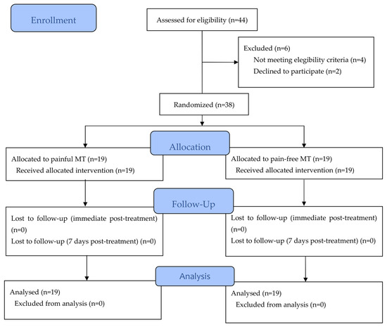 A total of 38 students with NSNP were included in the trial and randomly assigned to either the painful MT group (n = 19) or the pain-free MT group (n = 19) (Figure 1).