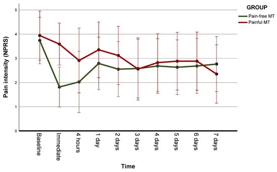 The ANOVA results did not show significant group x time interactions (F = 1.86, p = 0.112, η2 = 0.052). However, there was a moderate effect of time (F = 3.32, p = 0.011, η2 = 0.087) (Table 3). The contrast tests revealed significant differences in the immediate post-treatment assessment and at 4 h compared to baseline in the pain-free MT group. In contrast, in the painful MT group, significant differences were found only at day 7. When comparing the effect between groups, there was a significantly greater decrease in post-treatment pain in the nonpainful MT group than in the painful MT group. However, no differences were found between groups at any other times (Table 3) (Figure 2).