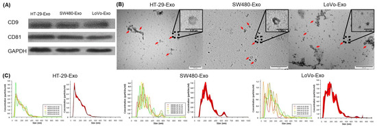 Identification and characterization of colon cancer-cell-derived exosomes. (A) Immunoblotting assay for exosome markers detected (CD9 and CD81) in exosomes from HT-29 (HT-29-Exo), SW480 (SW480-Exo), and LoVo cells (LoVo-Exo). (B) Exosomes detected using transmission electron microscopy (scale bar, 1 µm). The red arrowhead points toward exosomes. (C) HT-29-Exo, SW480-Exo, and LoVo-Exo were detected using Nanosight tracking analysis. The left column represents batch-to-batch variations, while the right column shows the overall size of HT-29-Exo, SW480-Exo, and LoVo-Exo. The mean sizes of HT-29-Exo, SW480-Exo, and LoVo-Exo were 178.3 ± 1.3 nm, 250.9 ± 3.4 nm, and 229.7 ± 8.7 nm, respectively, while their mean concentrations were 4.95 × 109 ± 4.41 × 107, 1.20 × 109 ± 1.82 × 107, and 1.86 × 109 ± 1.22 × 107 particles/mL, respectively.
