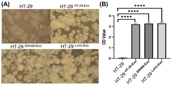 Proliferative effect of exosomes derived from colon cancer cells. HT-29 cells were treated with HT-29-Exo, SW480-Exo, and LoVo-Exo at the same concentration of 100 µg/mL for 24 h, and the proliferation was assessed. (A) All three exosomes increased the cellular proliferation of the HT-29 cells. (B) In the MTT assay, the exosome-treated HT-29 cells showed higher viability than the untreated control cells. Bars represent mean ± standard deviation (SD); n = 3; **** p < 0.0001.