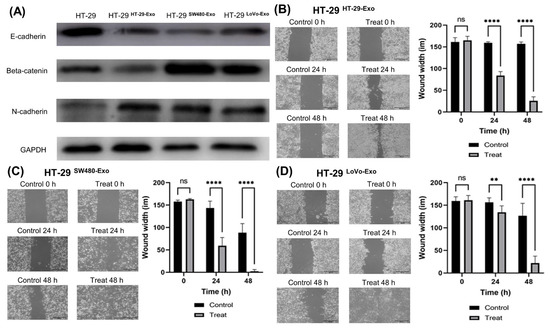 EMT induction by exosomes derived from colon cancer cells. (A) E-cadherin, beta-catenin, and N-cadherin expression analyzed in exosome-treated HT-29 cells. Glyceraldehyde-3-phosphate dehydrogenase was used as the loading control. (B–D) Representative images of wound-healing assay performed after treatment with cancer-cell-derived exosomes. The bar graphs on the right show wound width. Data show mean ± SD (n = 3). ** p < 0.01, **** p < 0.0001.
