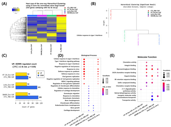RNA sequencing data analysis of PBS-treated Cancer-associated fibroblasts (CAFs) (PBS-CAF), HT-29-Exo-treated CAFs (HT-29_Exo-CAF), SW480-Exo-treated CAFs (SW480_Exo-CAF), and LoVo-Exo-treated CAFs (LoVo_Exo-CAF). (A) Heatmap of hierarchical clustering showing differentially expressed genes (rows) among CAFs treated with exosomes from different sources. Yellow and blue indicate upregulated and downregulated genes, respectively. (B) Dendrogram of hierarchical clustering indicates the similarities in gene expression among the exosome-treated CAFs. (C) Differentially expressed genes between control and exosome-treated CAFs. The yellow and blue bars indicate the number of upregulated and downregulated genes in exosome-treated CAFs compared with control CAFs, respectively. (D,E) Functional enrichment analysis of highly regulated genes among CAFs in the five experimental groups. Distribution of gene ontology (GO) terms of DEG was annotated in terms of biological processes and molecular functions. All colored circles indicate statistical significance (p < 0.05). The size of the circles indicates the between-group gene ratio.