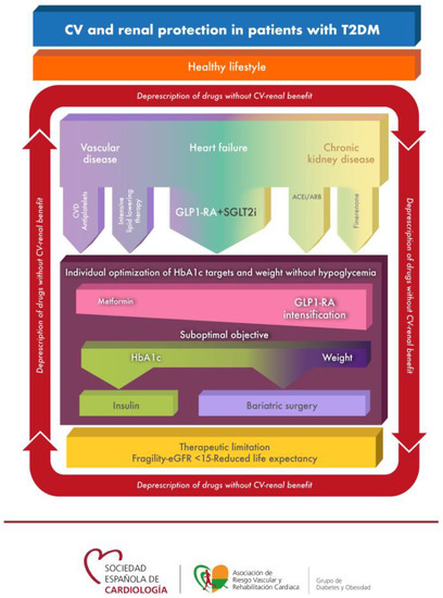 Type 2 diabetes (T2DM) increases the risk of developing atherosclerotic vascular disease, heart failure (HF), chronic kidney disease (CKD) and of death [3]. This is especially important in patients with high or very high cardiovascular (CV) risk, which represent the majority of people with T2DM [4]. Therefore, it is essential to act in the early phases of the disease, through the intensification of lifestyle changes and the prescription of those drugs that have been shown to reduce these complications. As a result, the goal of treatment should be not only to achieve glycosylated hemoglobin (HbA1c) targets, but also to promote weight loss, improve control of other CV risk factors, and the use of those antihyperglycemic drugs that have demonstrated vascular-renal benefit [3,5,6]. In this way, the optimization of treatment through an overall and comprehensive approach to the patient with T2DM implies that the healthcare system should not delay the intervention until the patient has had a CV or renal event (a strategy formerly known as secondary prevention), but since cardiorenal risk is continuous, the double objective should be implemented early, as the benefit will be greater [7,8].