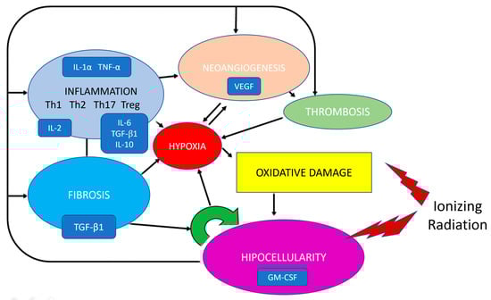 Simplified model of the complex network of interacting processes and signals in the pathogenesis of radio-induced injury.