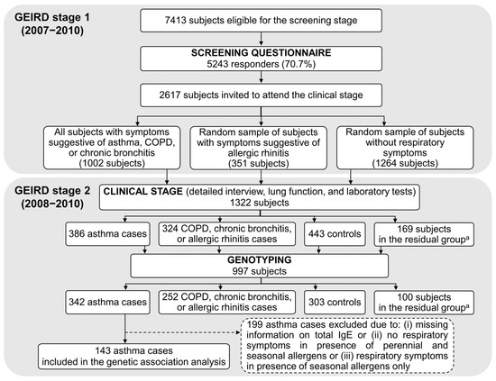 GEIRD is a candidate gene-based, (multi)case-control study on the role of genetic and modifiable factors in respiratory diseases (asthma, chronic obstructive pulmonary disease (COPD), chronic bronchitis, and allergic rhinitis) in adults. The protocol is described elsewhere [22]. Briefly, cases and controls were identified through a two-stage process in pre-existing cohorts [23,24,25] and in new random samples of the Italian general population [22]. Stage 1 (2007–2010) was the screening phase, in which 7413 subjects from the Verona centre received a respiratory health screening questionnaire by mail (response rate 70.7%; Figure 1). Stage 2 (2008–2010) was the clinical phase, in which 2617 responders to the screening questionnaire in Verona underwent a detailed interview, spirometry, and laboratory tests for identifying cases and controls.