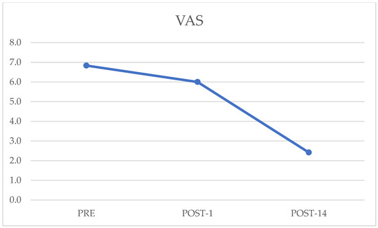 The VAS test result in the preoperative evaluation was 6.8 ± 2.4. The mean value reported on the first postoperative day was 6 ± 2.3, while the value reported on the fourteenth postoperative day was 2.4 ± 0.9. Data analysis comparing preoperative and postoperative day 14 values showed statistically significant improvement (p = 0.0003); comparison of data from postoperative day 1 and postoperative day 14 also showed statistically significant improvement (p = 0.00004) (Figure 1).