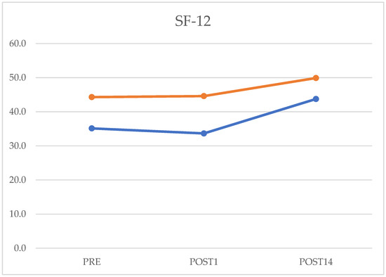 Preoperative, postoperative day 1, and postoperative day 14 values of Short Form-12 (SF-12) questionnaire. The orange line represents MCS-Mental Component Summary (SF-12 MS); the blue one represents PCS-Physical Component Summary (SF-12 PS).