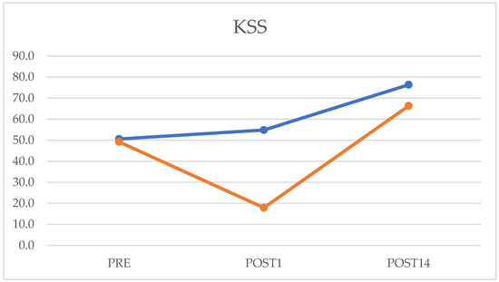 Preoperative, postoperative day 1, and postoperative day 14 values of Knee Society Score (KSS) questionnaire. The orange line represents the Knee Society Function Score (KSS-F); the blue one represents KSS.