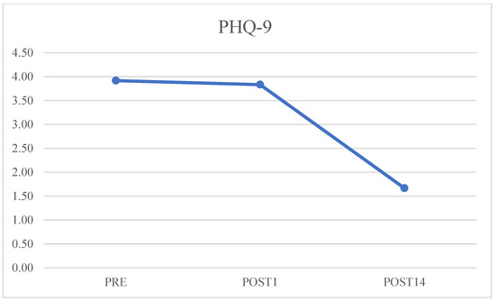 The PHQ-9 result after the preoperative questionnaire administration was four (2.25–4), on the first postoperative day it was three (3–4), and on day 14 it was one (0.25–2). After comparing preoperative and postoperative data on the 14th day, there was a statistically significant improvement (p = 0.0002). The same improvement is obtained by comparing data on the 1st day with the 14th day (p = 0.0003) (Figure 4).