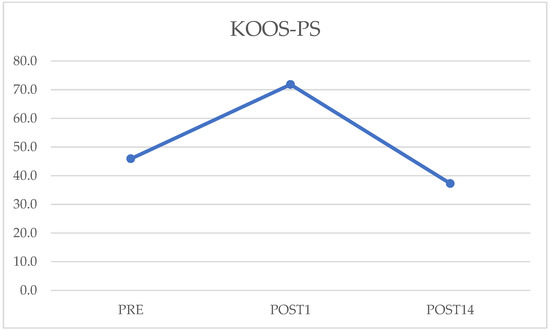 Preoperative, postoperative day 1, and postoperative day 14 values of Knee Injury and Osteoarthritis Outcome Score-Physical Function Shortform (KOOS-PS) questionnaire.