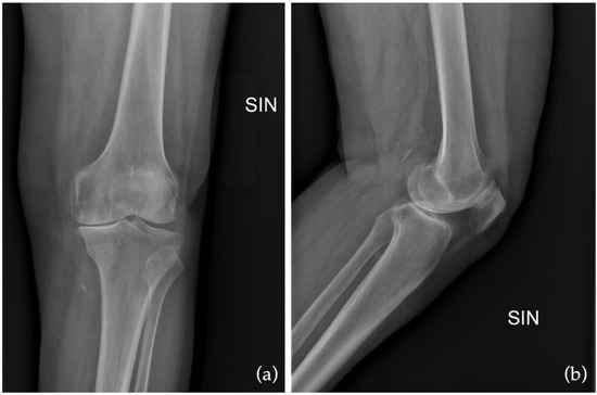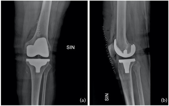 Finally, the preoperative outcome of the KOOS-PS questionnaire is 46.25 (5–48), on the first postoperative day it is 71.8 (7.5–72.5), and on the fourteenth day it is 35.5 (6–35.5). Again, comparing preoperative data with those on postoperative day 14 showed improvement but was not statistically significant (p = 0.07). However, comparing those on the first postoperative and the fourteenth, there was a statistically significant increase (Figure 5). The values are summarized in Table 1. Examples of preoperative and postoperative images are shown in Figure 6 and Figure 7.