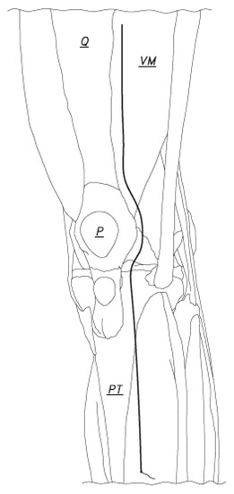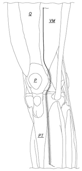 The Vastus Medialis Oblique (VMO) fascia was repaired up to the quadriceps tendon edge by running the number 1 suture anchored at the superior pole of the patella (proximal double hashed line). When the proximal anchor suture tail was reached and the fascia was anatomically reapproximated, the suture was tied to the tail that was left intact after the proximal anchor stitch had been tied (Q: Quadriceps tendon, VM: Vastus Medialis, P: Patella, PT: Patellar tendon).
