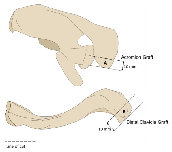 Free bone grafts were obtained from the acromion and clavicle. The acromion was marked 10 mm from its anterior edge, and a single vertical cut using a handsaw was made to obtain the acromion graft (Figure 1). The acromion graft was oriented such that its inferior surface formed the articular surface of the glenoid after the repair. The clavicle was marked 10 mm from its distal edge anterolaterally. A single cut perpendicular to the clavicle’s long axis was made to obtain the clavicle graft (Figure 1). The clavicle graft was similarly orientated such that its inferior surface formed the articular surface of the glenoid after the repair.