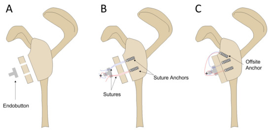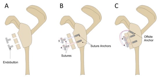 - Barret, H.; Chelli, M.; Van Der Meijden, O.; Langlais, T.; Boileau, P. Arthroscopic Latarjet: 2 or 4 Cortical Buttons for Coracoid Fixation? A Case-Control Comparative Study. Am. J. Sports Med. 2022, 50, 311–320. [Google Scholar] [CrossRef] [PubMed]