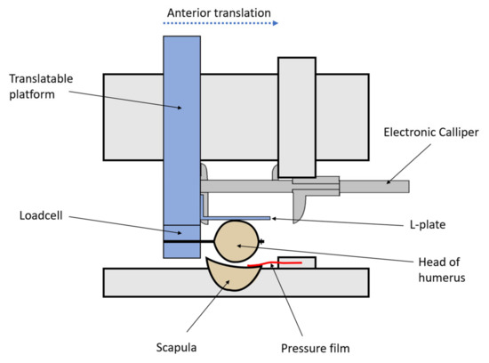 Glenohumeral adduction was fixed by aligning the humeral shaft parallel to the defect line on the glenoid such that any anterior–posterior force would be perpendicular to the defect line. An L-plate was fastened against the lateral border of the humeral head to maintain this position between tests and directed the anterior translational force linearly against the glenoid rim by preventing lateral displacement of the humeral head.
