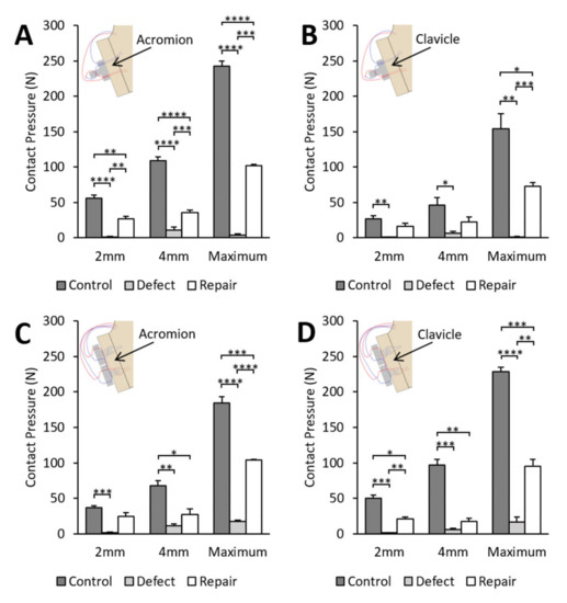 Contact pressure at 2 mm, 4 mm and maximum contact pressure at dislocation between the humeral head and glenoid for four scenarios. In each group, testing was performed for control glenoid, 30% by-width defect glenoid and after repair with (A) modified buckle-down technique with acromion, (B) modified buckle-down technique with clavicle, (C) cross-link technique with acromion or (D) cross-link technique with clavicle. Values are expressed as mean ± standard error of the mean with n = 6 in each group. * p < 0.05, ** p < 0.01, *** p < 0.001, **** p < 0.0001. Comparisons within groups were performed using one-way ANOVA with repeated measures.