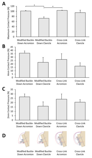 Contact pressures after repair for the four groups. (A) Maximum contact pressure. The maximum contact pressure of the modified buckle-down technique with clavicle was significantly lower than the modified buckle-down technique with acromion and cross-link technique with acromion. (B) Contact pressure at 4 mm. (C) Contact pressure at 2 mm. (D) Diagrams of corresponding repair. * p < 0.05. Comparisons between groups were performed using one-way ANOVA on ranks (Kruskal–Wallis test) with Dunn’s correction.